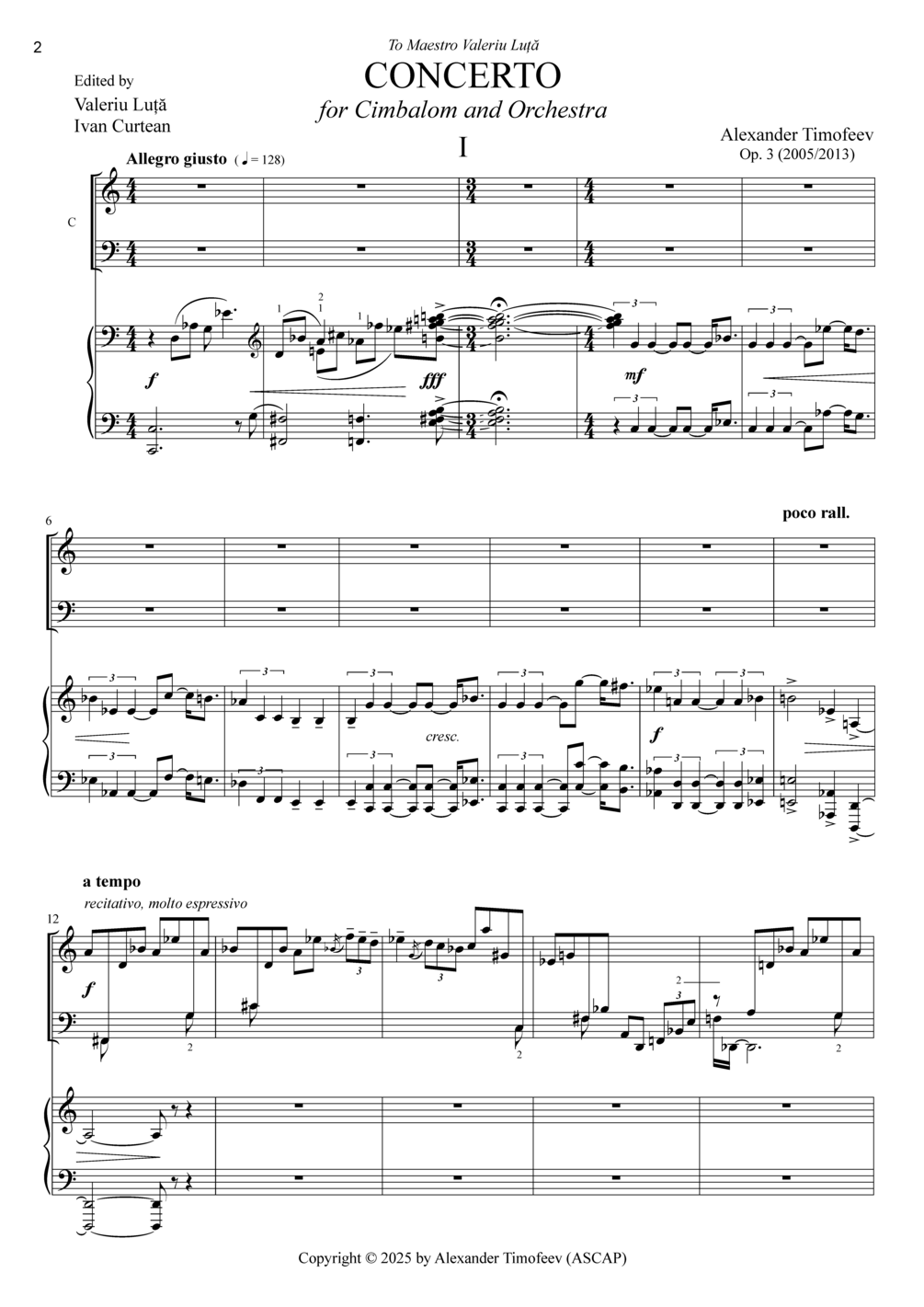 Concerto for Cimbalom and Orchestra (2005/2013) by Alexander Timofeev. Cimbalom and Piano reduction by the composer. Edited by Valeriu Luta and Ivan Curtean. Duration: 30'. PDF, 56 pages. New engraving edition of the Cimbalom and Piano reduction (2025).
